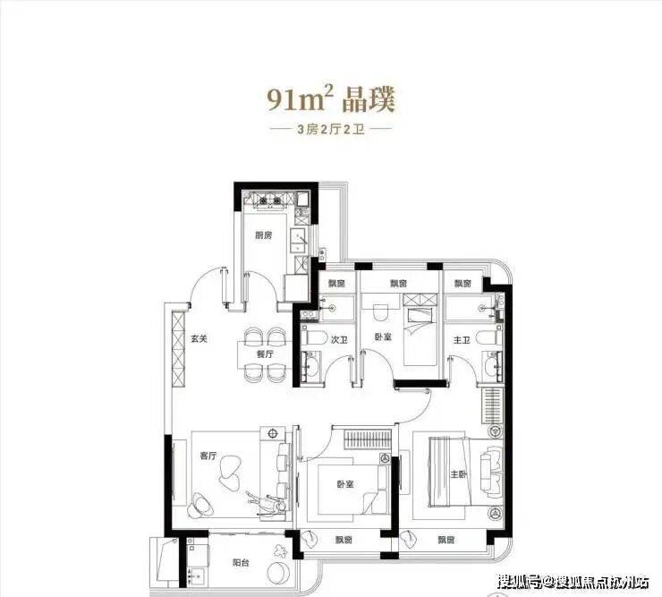 约91平3房户型,餐客厅一体,主卧套间,全屋飘窗,功能齐全。