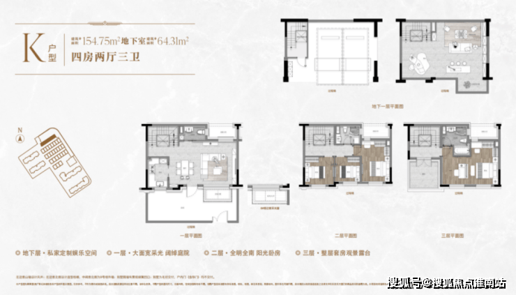 风貌别墅:建面约131-154㎡,地上三层+地下一层,附赠地下室、花园、露台。