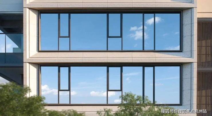 其次是建筑采用经典的三段式立面,集合仿石铝板、三玻两腔LOW-E玻璃和香槟色铝板线条,形成方正有序的框感,既有超奢美学,也把每一户的居住领地感拉到极致。