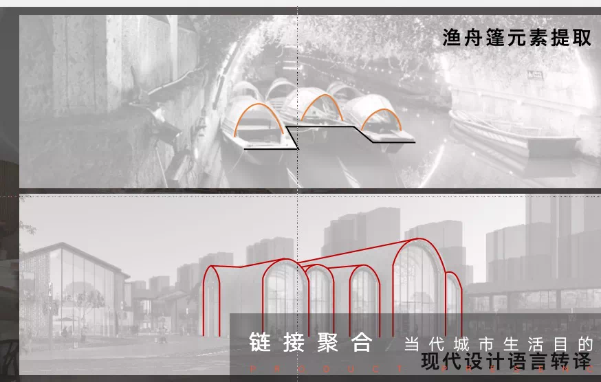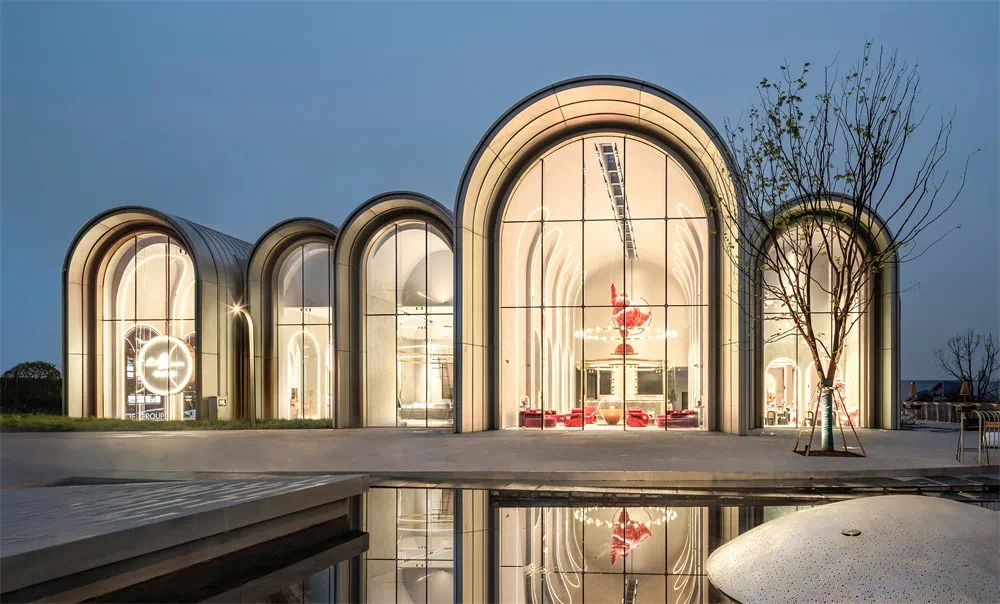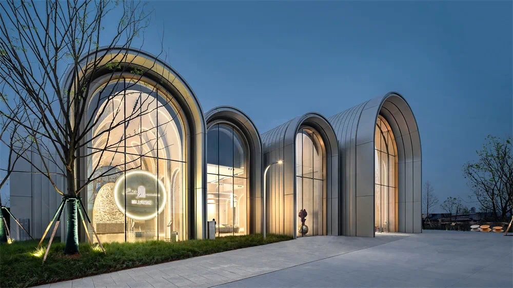 上河之城「大乌篷艺术中心」主题示范区在设计上,旭辉结合绍兴渔乡记忆中渔舟篷元素提取,再转译成现代设计语言,用巨型的大乌篷状拱门,打造绍兴又一标志性的城市名片。