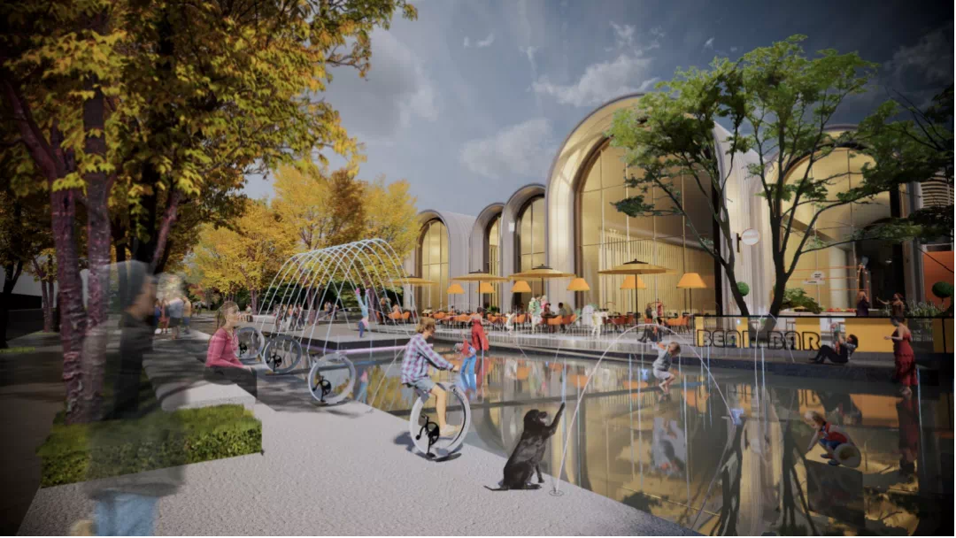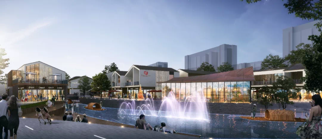 结合渔舟印记与船痕语言,在售楼中心前方打造挑高的码头概念,同时结合两侧波光喷泉,亲水水景中的脚踏车、跳跳泉与喷水鲸鱼互动装置,作为整个水街购物公园的活力起点。