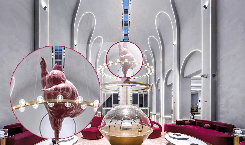 另一个亮点,则是在水吧区的中庭打造的一个大型装置——旋转舞者,灵感出自于哥伦比亚著名艺术大师“费尔南多 博特罗”肥胖的蒙拉丽莎系列作品,传达的是一种对生活和艺术的姿态,自由、开放,翩翩起舞,充满戏剧性又极具视觉张力。