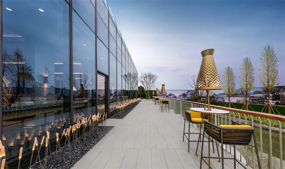 大片的玻璃幕墙打破传统风格的束缚,将室外的自然空间无限延伸至室内,营造出通透的整体空间,无形中拉长了区域的视觉高度与宽度。明亮干净,是绍兴缥缈水烟的渔舟唱晚带给人的空间记忆。