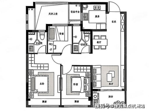 阔绰四房格局, 全明通透 ,空间尺度感十足。 南向双卧室 ,主卧尊享独立卫浴与衣帽间。客餐厅一体,连接超大阳台,形成气派的家庭社交核心。多功能空间可根据需求改造为书房、儿童房或健身房,满足改善家庭对空间的所有想象。