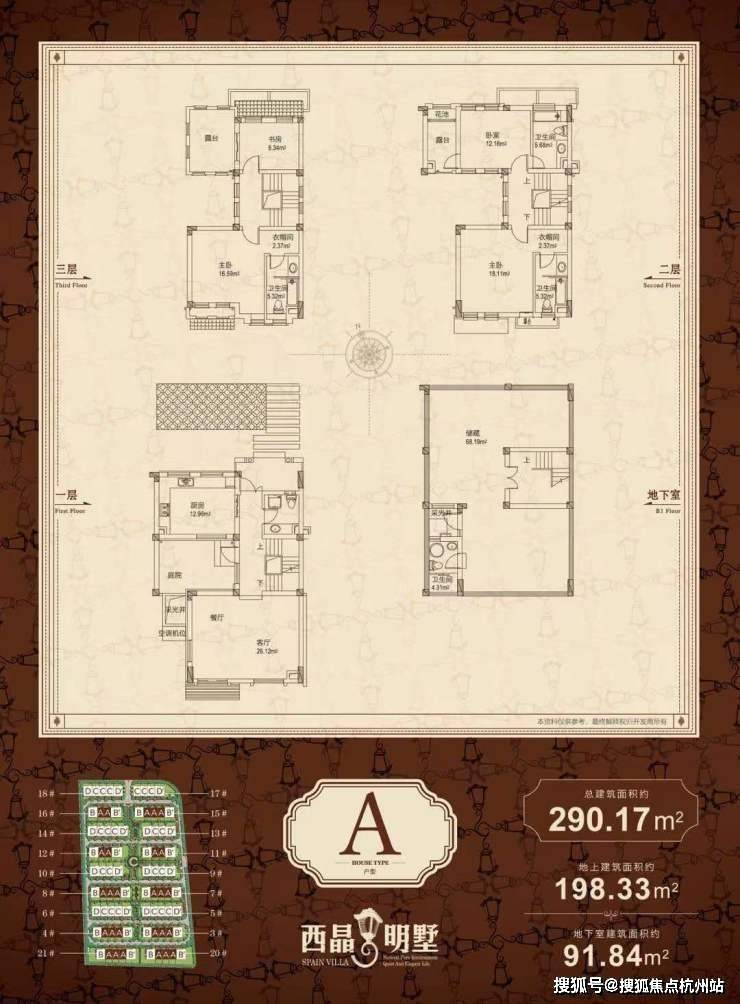 A户型: 面积290.17平方米(包含198.33地上和91.84地下)
