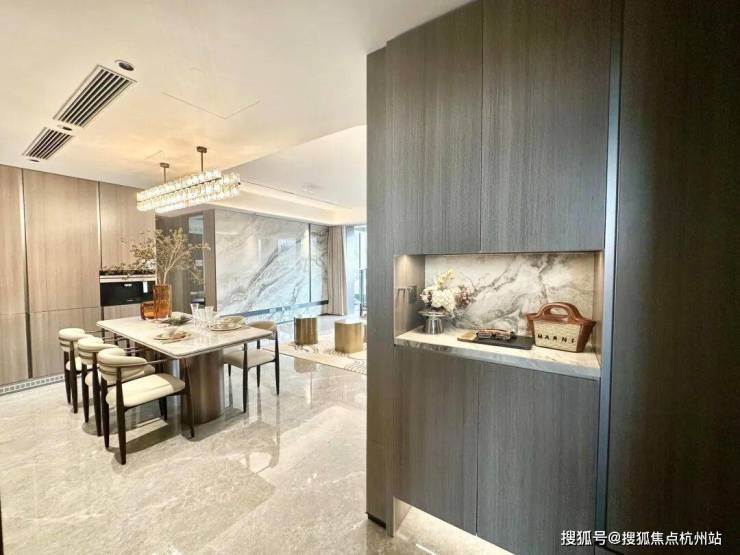 厨电配置方太的顶配系列:上方送风下方吸油烟的空调油烟机、灶蒸烤一体机;客厅配置内嵌式卡萨帝双拼冰箱;客厅大理石岩板电视背景墙面、弧形吊顶均为交付标准;