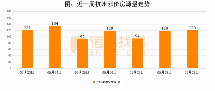 根据诸葛找房数据显示,杭州24小时涨价房源量为120套,较05月28日增加1套,环比上涨0.8%。与此同时,涨价房源占比小幅扩大,业主信心有所提升。