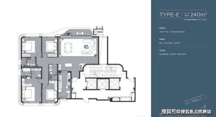 约240㎡江景四房约8.6米超宽横厅进门即见江景;约55㎡LDK一体化空间,餐厅、客厅与西厨岛台形成“社交主轴”,开阔奢朗;南北双套房配置,约30㎡南向主卧套房,集独立衣帽间、SPA卫浴、约4.3米开间睡眠区为一体,北套房4.3米面宽搭配江景视野,即便在上海400㎡以上豪宅中也属罕见.
