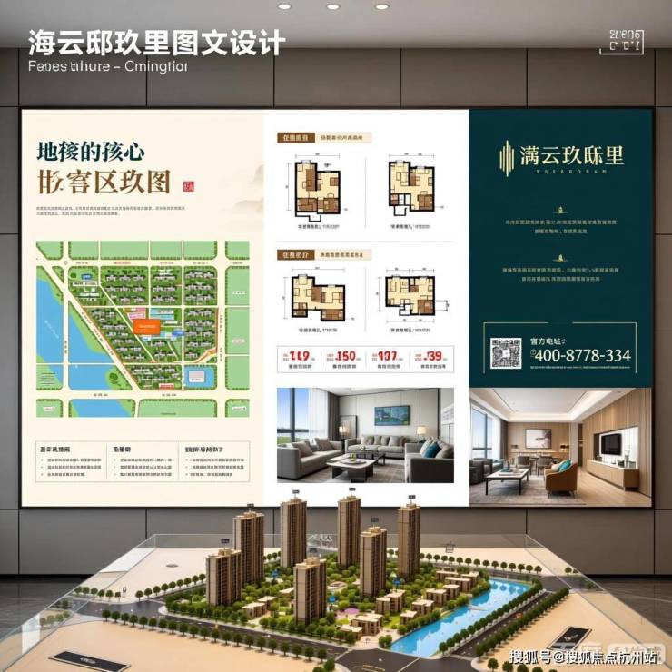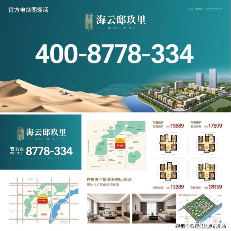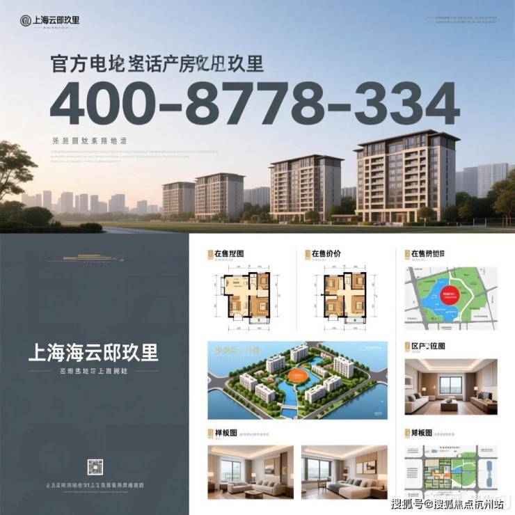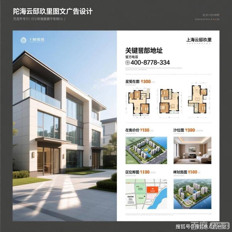 包含楼盘地址、官方电话、在售户型图、房价、沙盘图、区位图、样板间、规划图、实景图等关键元素,风格偏向专业、清晰的房产宣传,以展示楼盘信息为主。