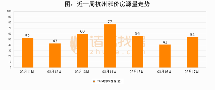 根据诸葛找房数据显示,杭州24小时涨价房源量为54套,较02月16日增加13套,环比上涨31.7%。与此同时,涨价房源占比小幅扩大,业主信心有所提升。