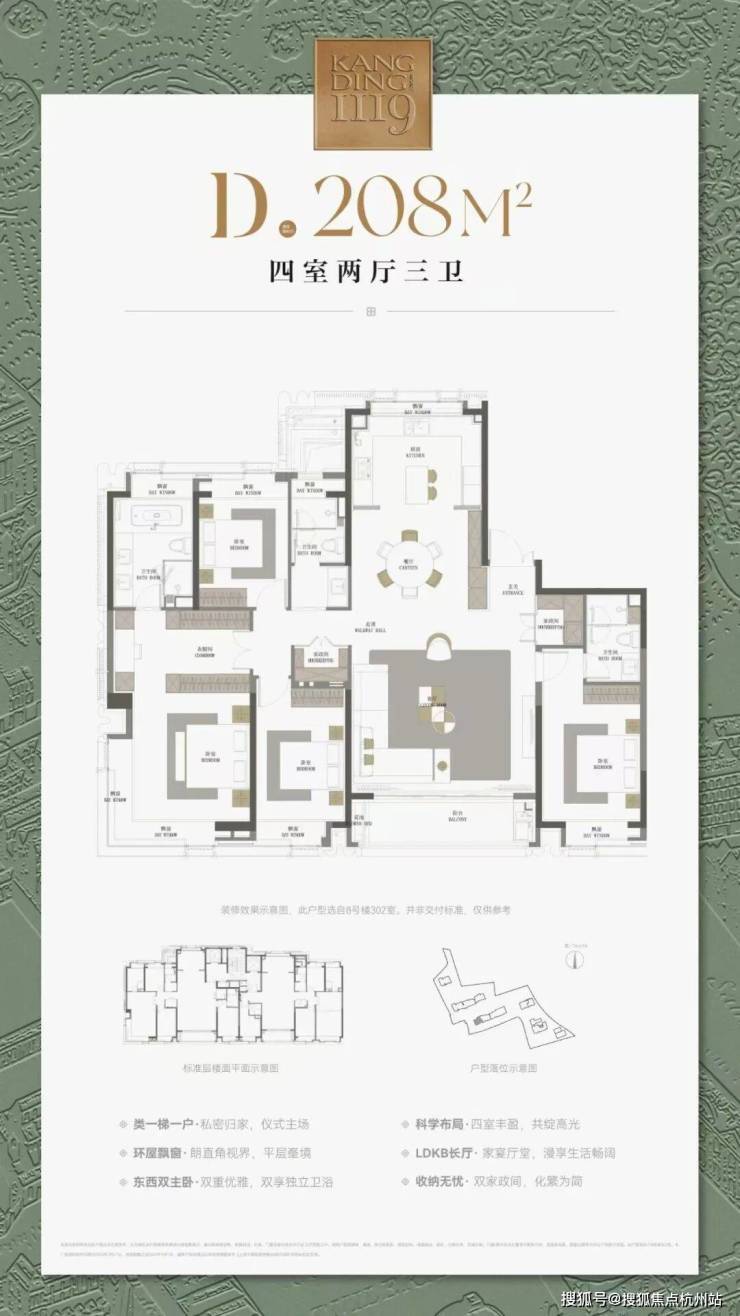 建面约208㎡4房:四开间朝南的边套宽奢4房,约270°的巨幕采光面,让这个户型的每一个空间都充满阳光,终极改善的首选户型。