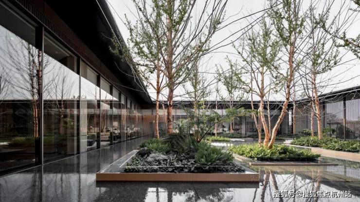 大量美国鲑鱼粉河桦树阵为主体的水上森林,与林下的金钱草、迷迭香、笔筒树等植被交相呼应,形成极富特色的前场景观。廊中水景树阵的设计,营造出丰富的景观空间,增添业主归家的仪式感。
