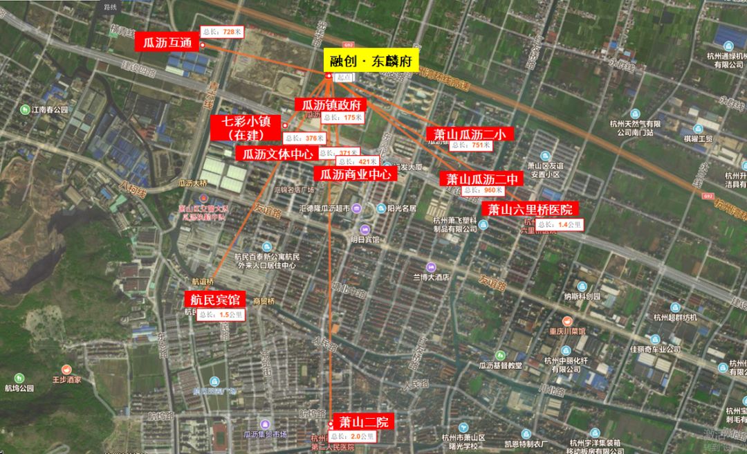 通过距离的对比,我们会发现,瓜沥镇政府所在地并不是原来印象中偏远的所在。它和过去的下沙一样,已经成为杭州城市骨架拉升的重要节点。