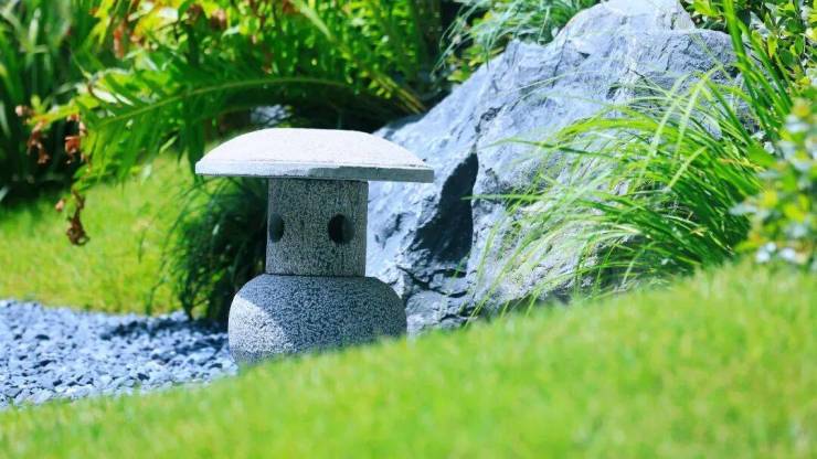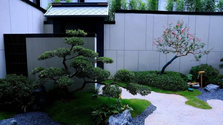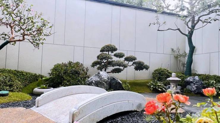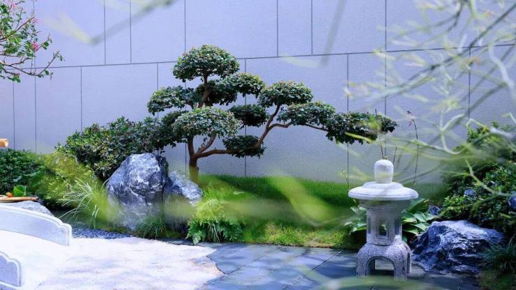 砂石象水, 铺叙山水之意境;起伏地形寓山,层次跌宕;造型绿植搭配置石造景,辅以整石水钵点缀、古朴石灯笼、石花架等传统意象元素,疏密有致,动静相宜。
