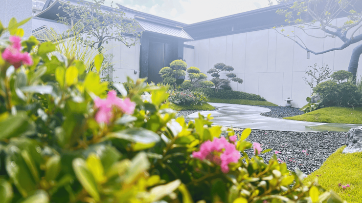 推开 院门 ,绿意葱茏送入眼帘。曲径缓缓铺展,串联起赤楠、铁冬青与斜飘造型紫薇,近、中、远景有序漫延,犹如一幅徐徐展开的迎宾画卷。