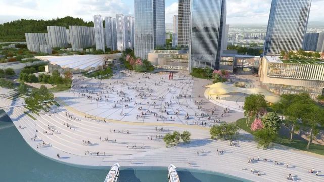 同时,以河流水域元素激活广场边界,广场外挑富春江,串联欢迎跳泉、科普微森林、互动浅滩、城市阳台、旅游码头、春江水秀剧场等丰富的滨水景观节点。
