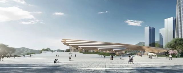 科技馆作为秦望广场的“点睛之笔”,由中国工程院院士崔愷大师操刀主笔,以富阳传统民间竹、纸造物的工匠技艺为启发,通过“以竹为骨、折纸成扇”的设计理念,形成特殊的折扇形屋面设计,塑造科技馆独特的造型与空间,努力打造醒目的滨江建筑地标。