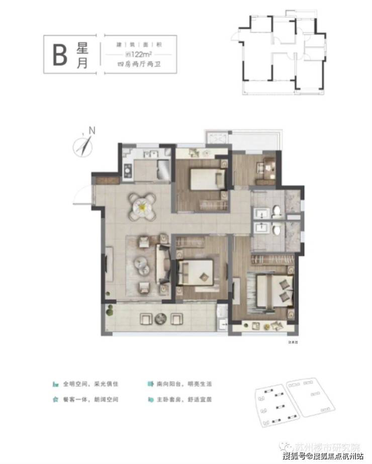 建筑面积约122㎡,四房两厅两卫,全明通透,三面采光,环幕观景。约6.7米宽景阳台,双卧飘窗设计,独立功能间,为生活带来更多可能。