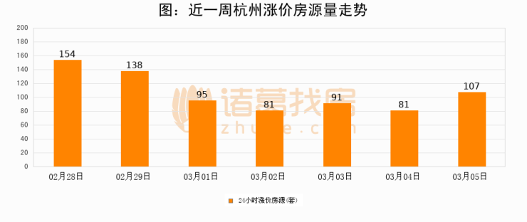 根据诸葛找房数据显示,杭州24小时涨价房源量为107套,较03月04日增加26套,环比上涨32.1%。与此同时,涨价房源占比小幅扩大,业主信心有所提升。
