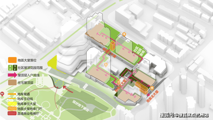 步行体验为每个人规划不同动线;中興傲舍项目,基于人的关系的角度去设计动线,在高混的业态中,为住宅用户创造私密性和独立性,如到达高线公园这一层都有门禁,只有住户能够抵达,从而将简单的道路线条演变为丰富的空间内容:出与入的记忆、城市与社区的联系、公区与私域的桥梁。