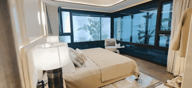 卧室的墙面是定制3D立体墙布,有更好的隔音效果,休息的时候帮你隔绝外界的喧嚣;微弧度设计,在心理上营造出被温柔环抱的安全感,营造出静谧的助眠氛围;飘窗也可以改成梳妆台,每天在晨光中梳妆打扮……