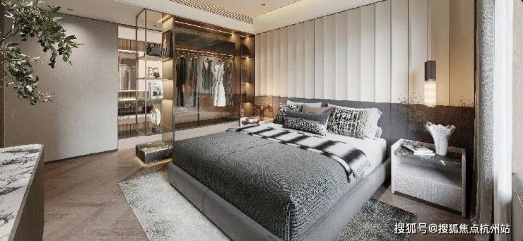 主卧拥 有 270度环幕飘窗, 视野和采光优越,配备了高奢卫生间,空间感、尊崇感拉到顶格。
