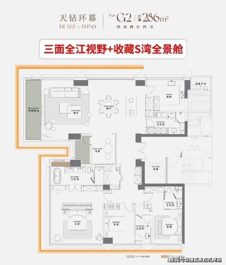 创新蝴蝶布局+真三面视野+超大全景画框+全套房设计。直面S湾,三面看江, 纵享S湾全景舱360°寰视江景巨幕。 真正划时代的滨江顶豪。