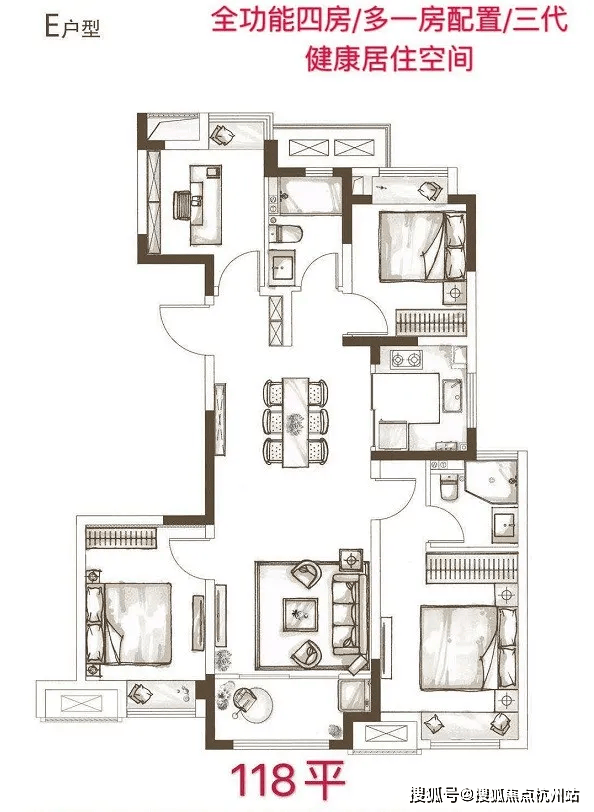 118㎡ 四室两厅两卫:适合多口之家,空间宽敞,部分为大横厅设计