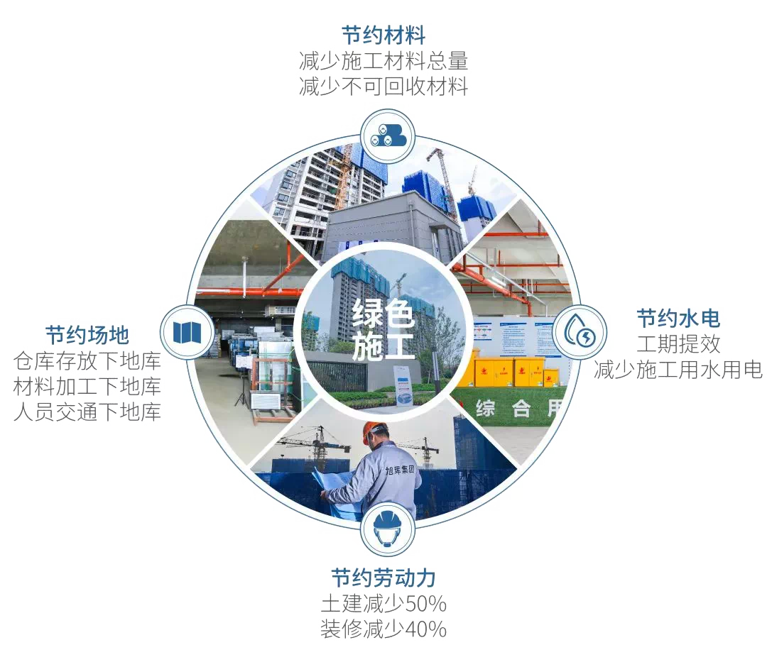 而由旭辉首次在地产行业提出打造建筑业“透明工厂”的理念,则通过新建造工艺的组合和有效的工序穿插,大幅度提升了工程质量和建造效率的同时,为绿色和安全文明施工提供了前提条件,场地、材料、水电与劳动力的消耗均得以节约,更环保、更符合可持续发展理念。