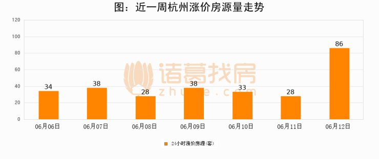 根据诸葛找房数据显示,杭州24小时涨价房源量为86套,较06月11日增加58套,环比上涨207.1%。与此同时,涨价房源占比小幅扩大,业主信心有所提升。