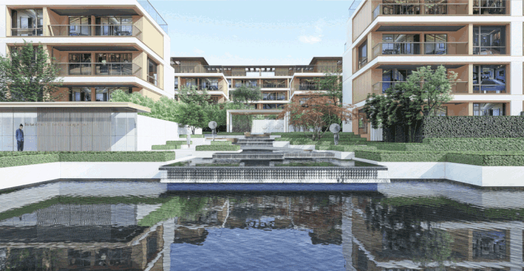 有背山必须傍水,从小区正门的独立高端会所进入园区后,之江壹品特意作了退进式梯度入口,中心引入意式跌水水景;从两侧围着水景、顺着山势的缓坡台阶漫步往上,在跌水的终端是卡洛斯卡帕式的雕塑出水口和一棵中型落叶乔木作纪念性空间;
