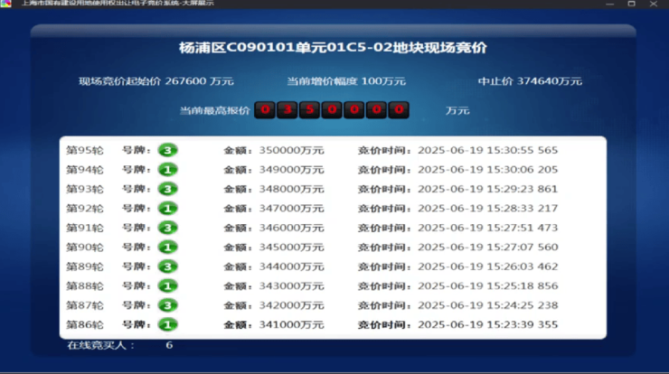 6月19日,2025年五批次土拍,保利发展经过95轮竞价摘得杨浦东外滩01C5-02地块(即保利外滩曜) ,成交总价350000万元,楼板价95530元/㎡,溢价率30.79%。