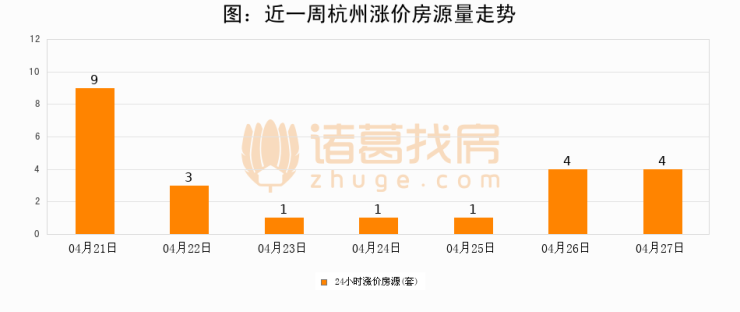 根据诸葛找房数据显示,杭州24小时涨价房源量为4套,较04月26日持平。