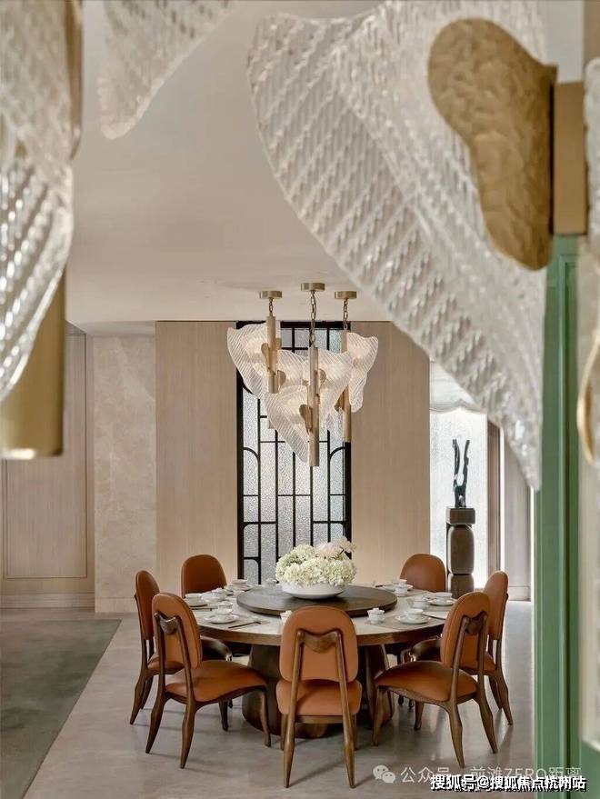 餐厅的设计巧妙融合了老上海的经典元素,圆形餐桌和橘色皮质餐椅在色彩上既现代又充满活力,顶部的水晶吊灯造型灵感来自上海市花“玉兰花”,既增添了空间的华丽感,又巧妙地融入了上海的地域特色。