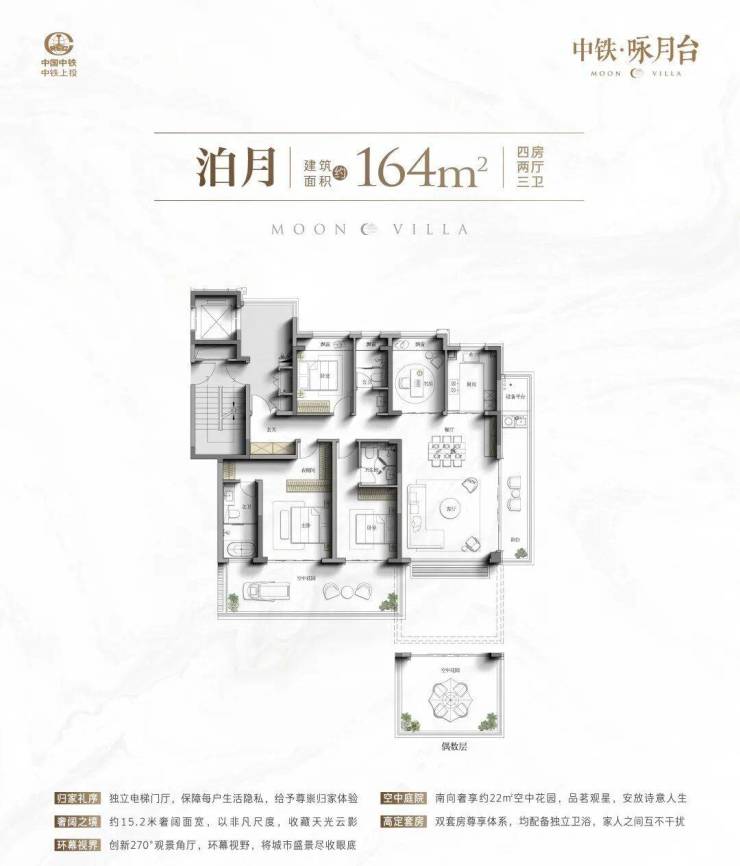 中铁·咏月台创新规划建面约162/164㎡四代洋房,以奇偶层错位的巧妙布局,为每户规划景观露台,实现空中花园的居住梦想。这既是一次对居住形制的革新,更让人与自然达成诗意共鸣。