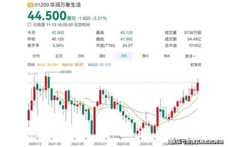 2024年以来,华润万象生活的股价,从低点18.34港元,最高涨至46.54港元,一度创下近两年新高,市值重返千亿港元。