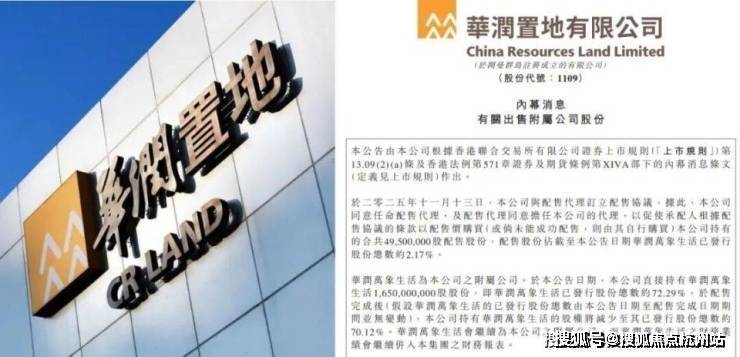 11月13日,华润置地公告,拟配售手中4950万股华润万象生活的股份,套现20.6亿港元。