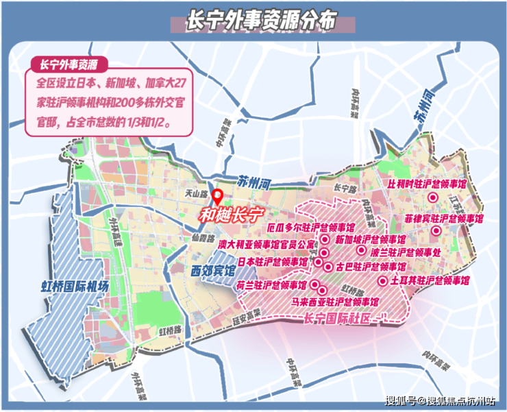 “外事客厅”的独一份定位,离不开长宁独一份的国际交通枢纽优势。作为全上海仅有与虹桥机场、高铁站“双枢纽”直接接壤的城区,其核心区域通过轨道交通、快速路网构建起“15分钟国际通勤圈”。
