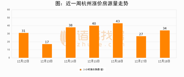 根据诸葛找房数据显示,杭州24小时涨价房源量为34套,较12月17日增加7套,环比上涨25.9%。与此同时,涨价房源占比小幅扩大,业主信心有所提升。