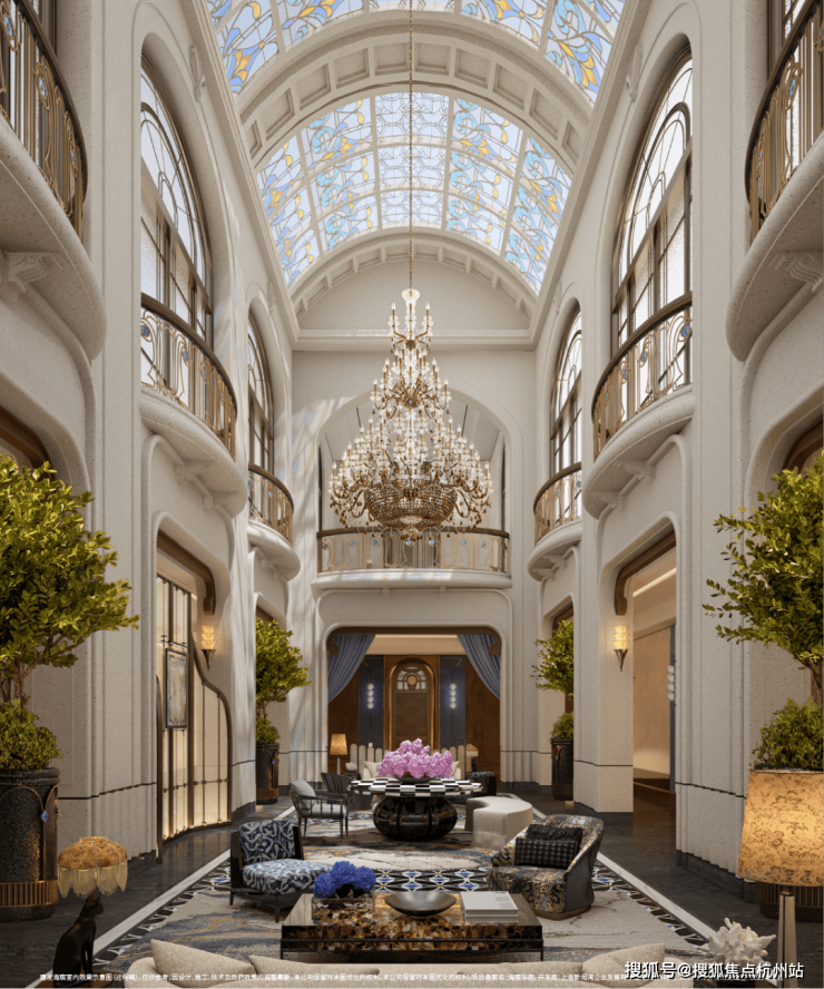 「玉兰门庭」摩登飘逸,环抱式落客前场,大师定制非遗掐丝珐琅门钹,流转温润光华,敬呈归家尊崇礼序,自此启幕生活的华贵序章。