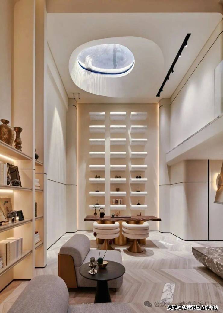 阅读区与茶室围绕在侧,更有配齐Dry Kitchen的酒吧。饮茶时光里,上层室外庭院的水景天窗在此投下变幻光影,让地下层亦浸润在盈莹逸动之中,且赋予整个空间艺术剧场般的特色。