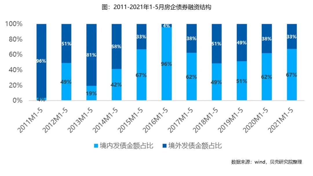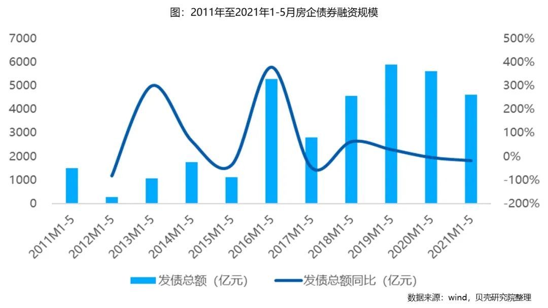 今年以来,房企融资还未出现明显的窗口期。据贝壳研究院统计,今年1-5月,房企境内外债券融资累计约4624亿元,较2020年同比下降18%,达到近三年低点。今年前5月,房企发债规模占比2020年全年约38%。