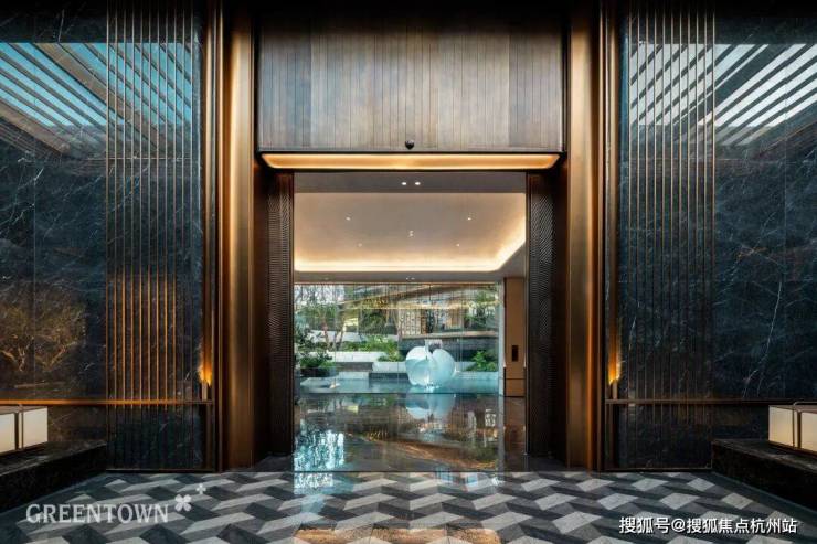 主入口 知·云栖,取意西湖十景以"洄游"为理念,超52米跨度的回字形布局,重构传统"四水归堂"空间序列,约2.4米 “流光礼宾” 塔冠,如悬浮的美学灯塔,与金色挑檐相映成辉,全封闭式阳台勾勒建筑轮廓,让立面如镜幕般收纳约30公里江岸鎏光!