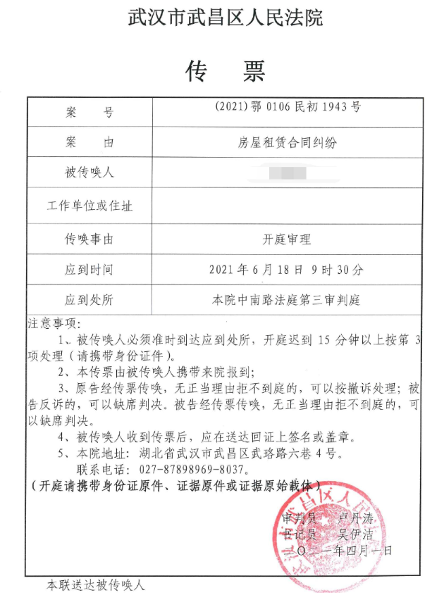 一位武汉租客在微博上晒出的法院传票