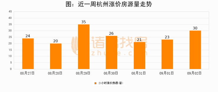 根据诸葛找房数据显示,杭州24小时涨价房源量为30套,较09月01日增加7套,环比上涨30.4%。与此同时,涨价房源占比小幅扩大,业主信心有所提升。
