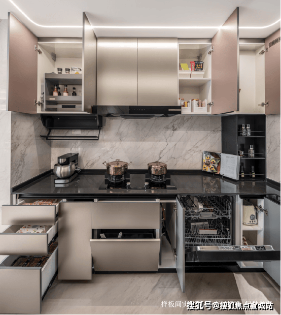 建发海宸巧妙利用空间拓展、功能分配、动线设置、超能收纳等实现了好厨房的“1步法则”,将操作步骤调配到舒适距离,让男女主人爱上下厨。
