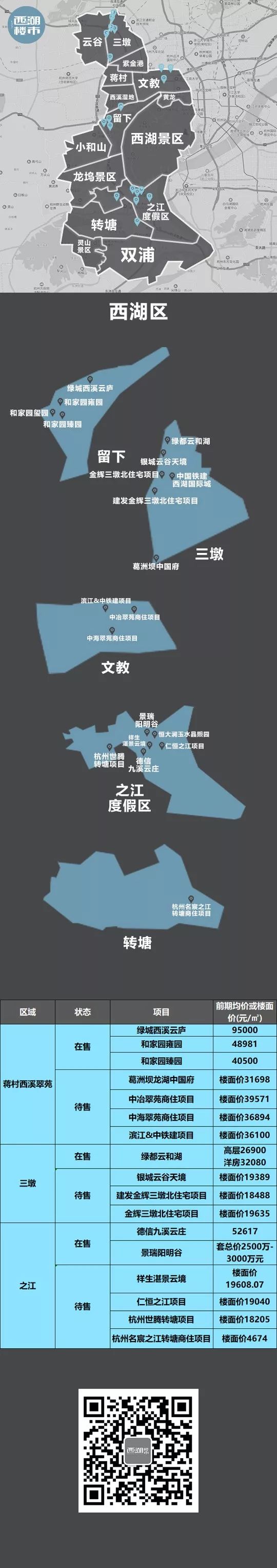 随着城市的发展,杭州各区域都有不少新的板块成长起来,而且板块的划分也越来越细。为了让大家对于各个板块能够有最全面的认识,西湖楼市做了一份《杭州最全楼盘板块分布图》,用图片的形式带大家清晰的了解板块的较新划分、所处位置,以及各个板块内在售和待售的项目。