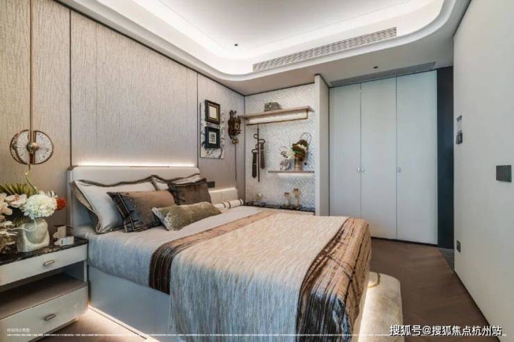 卧室则铺设海派鱼骨拼花地板,借木质肌理的温润与细腻,营造出私密领域的宁静氛围!这种“公区显质感、私域藏温度”的材质分区逻辑,恰是高端住宅设计中至关重要的一笔!