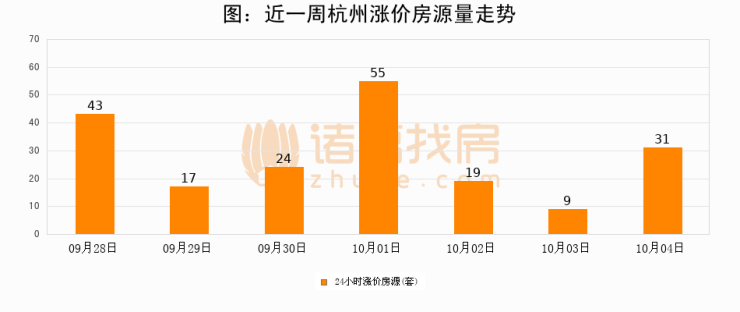 根据诸葛找房数据显示,杭州24小时涨价房源量为31套,较10月03日增加22套,环比上涨244.4%。与此同时,涨价房源占比小幅扩大,业主信心有所提升。