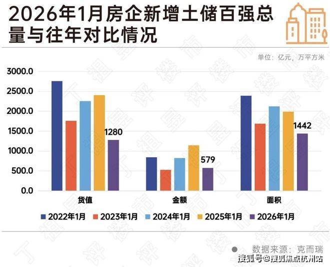 企业方面,2026年1月份,新增土储百强房企的新增货值、总价和建面百强之和分别为1280亿元、579亿元和1422万平方米,货值、金额降幅近五成,面积较同期下降28%。主要是受到1月份多城尚未开启新一年供应的影响。